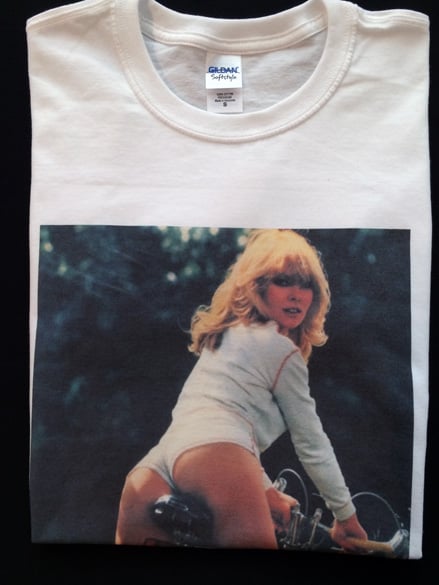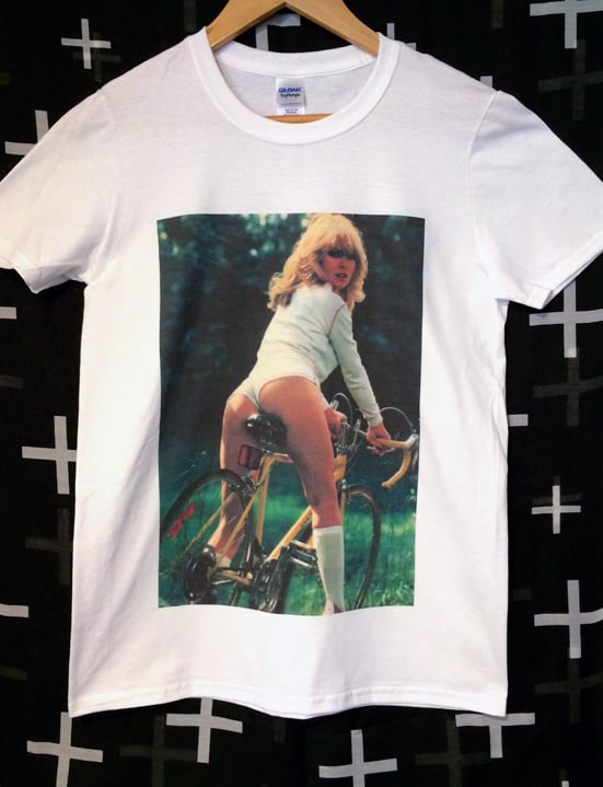 RETRO BIKER GIRL WHITE UNISEX CREW NECK T-SHIRT.
